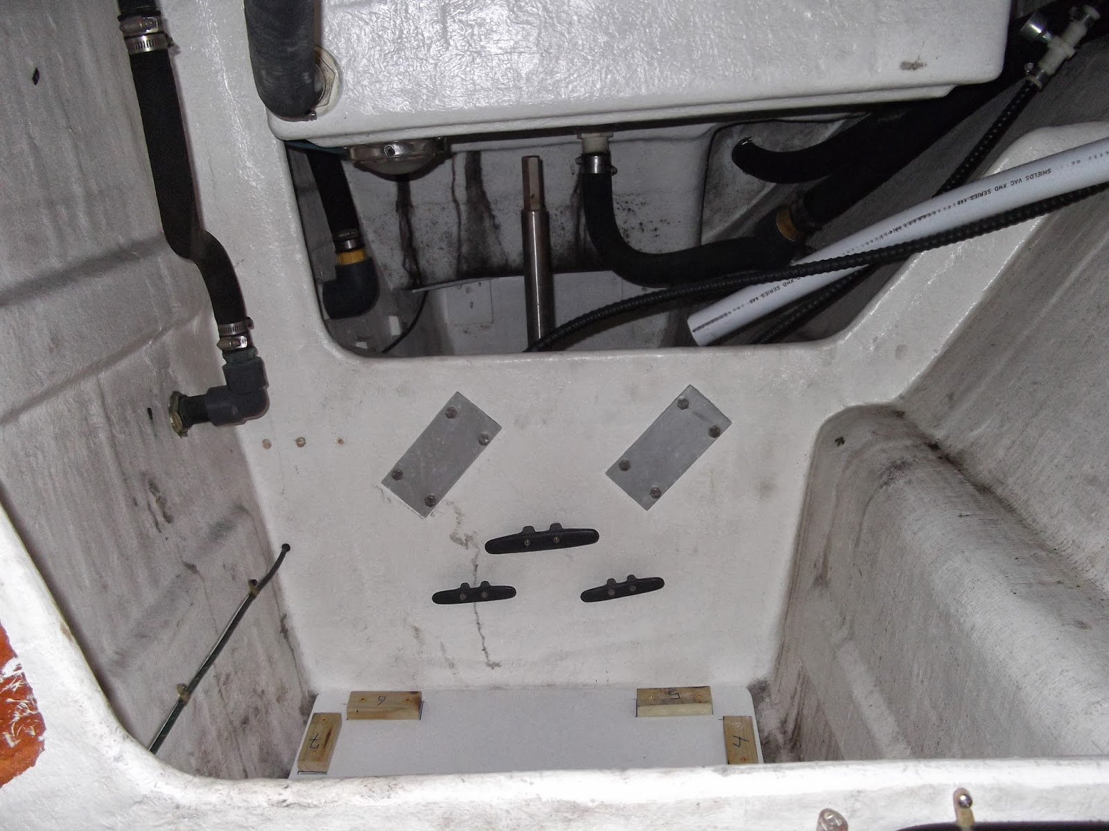 | Looking straight down. The new pump out hose is attached to the new tank. |